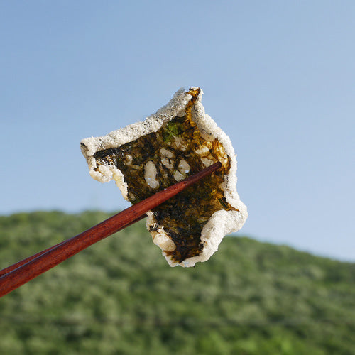 한국산 서천김에 한국산 찹쌀풀과 참깨 고명을 얹어 만들어진 김부각입니다. 손으로 직접 찹쌀풀을 김에 발라 튀겨낸 정성 가득한 김부각입니다.