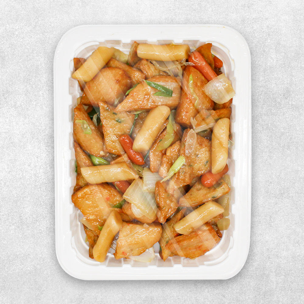 야채를 넣어 만든 두꺼운 한국산 어묵과 쫄깃한 떡을 함께 볶은 어묵떡볶음입니다. 일반 어묵과는 확연히 다른, 짜지 않고 고소한 탱글한 어묵을 드셔 보세요.